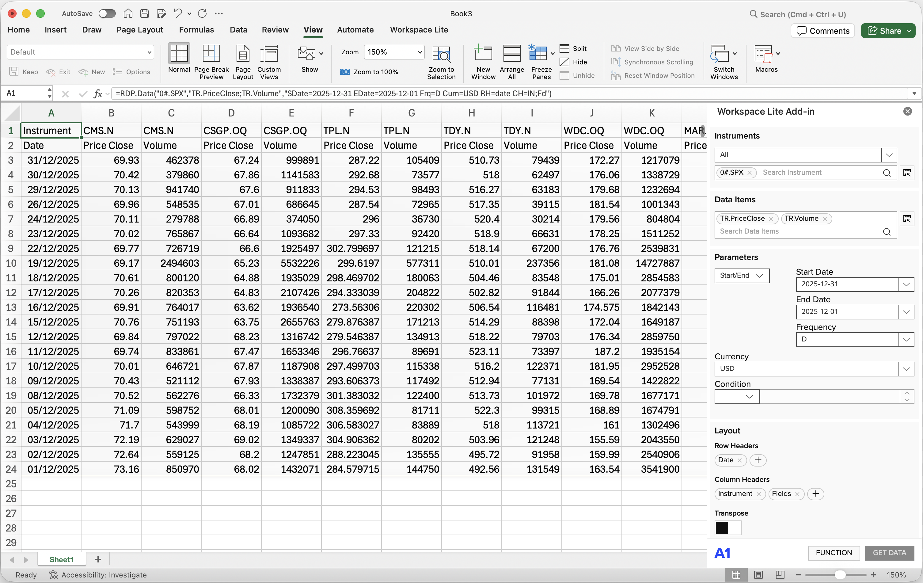 - illustrative example of a simple setup for downloading a structured panel of daily closing prices and trading volumes for all S&P 500 constituents for December 2025 in one single step in "Workspace Lite".